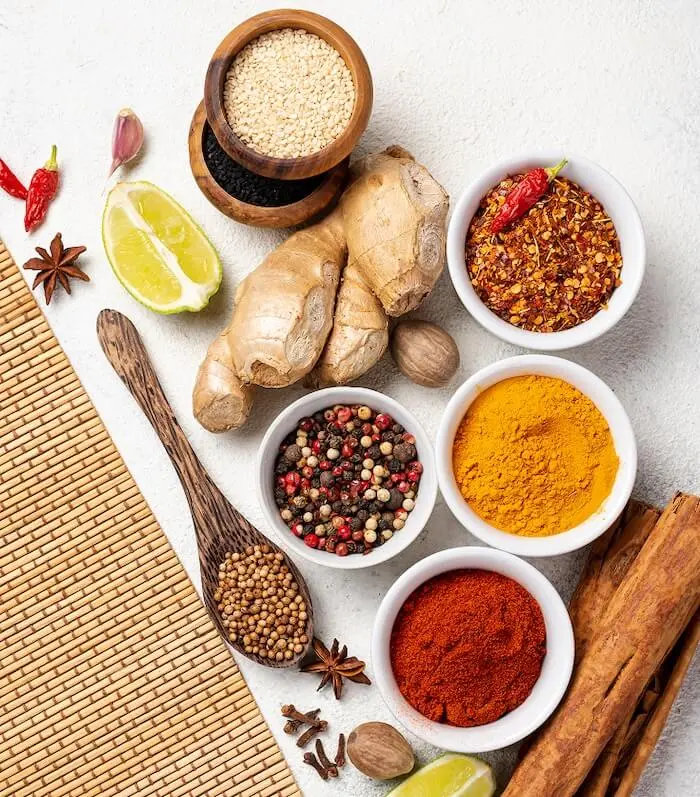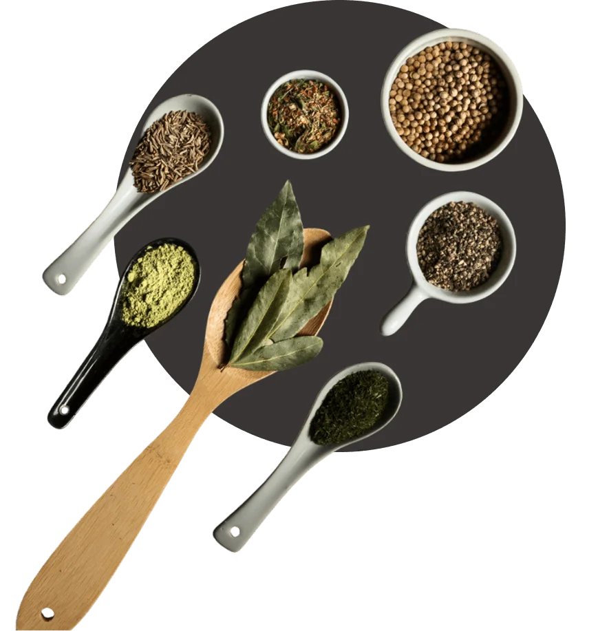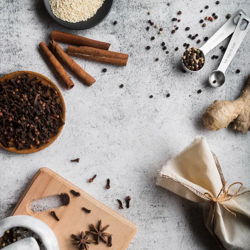 Nutmeg, Cloves, Cinnamon, Black Pepper.